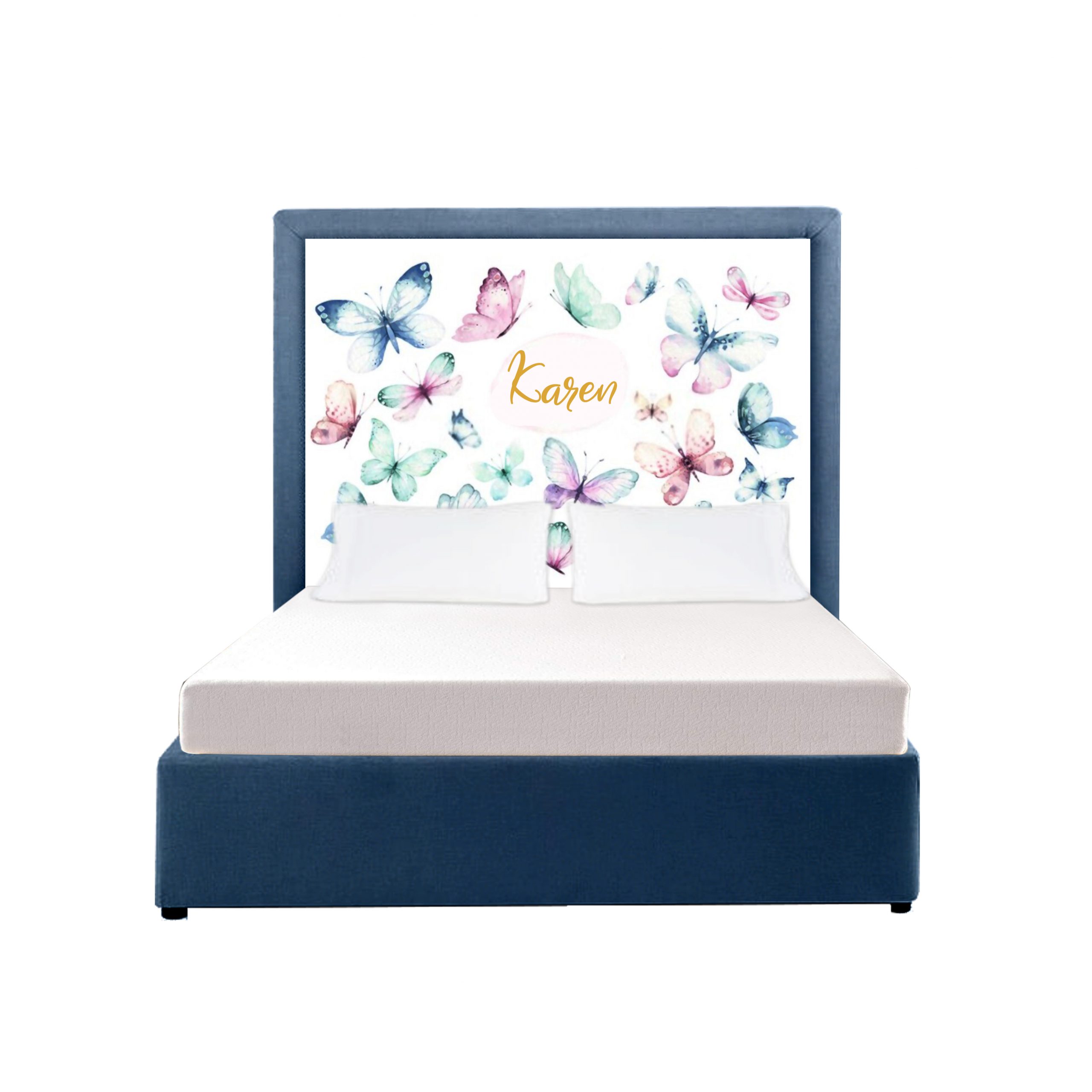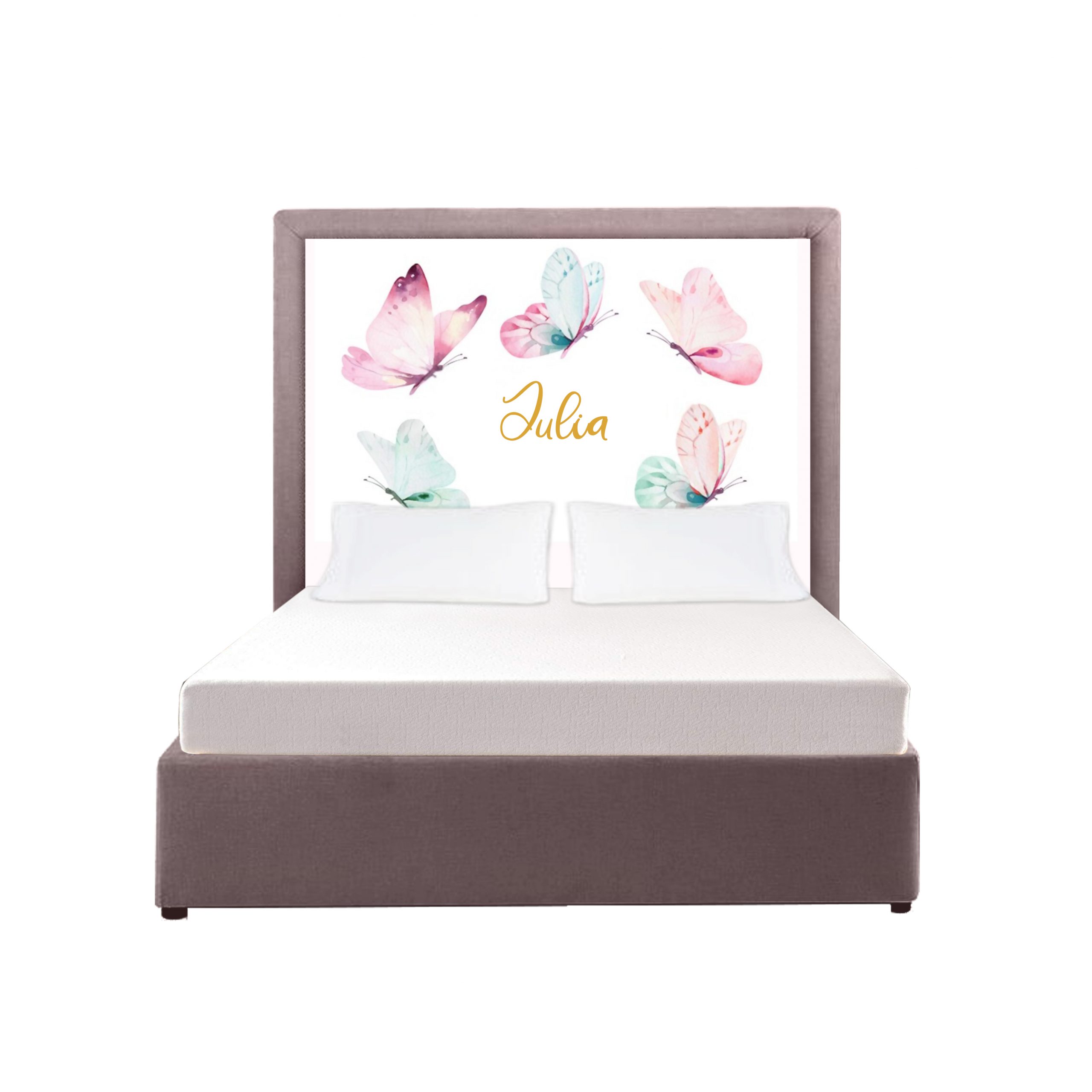 Etch your name among the butterflies. Add your name at checkout. Artwork will be sent for your approval after placing your order. The bed and base are two separate pieces. The headboard can be purchased on its own, or with a matching bed base, or with a matching base cover to cover your current bed base. Extra length at special request. Other designs available on request.